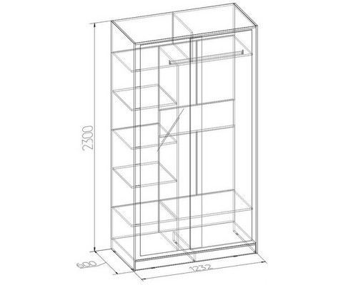 Шкаф оснащен стационарной штангой для вешалок, тремя полками, двумя нишами вверху и двумя внизу.
