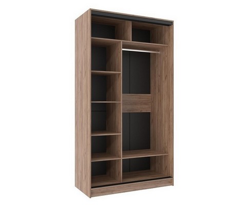 Внутреннее наполнение шкафа состоит из стеллажа для белья, четырех больших ниш внизу и вверху, а также стационарной штанги.