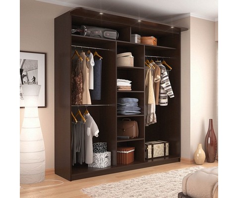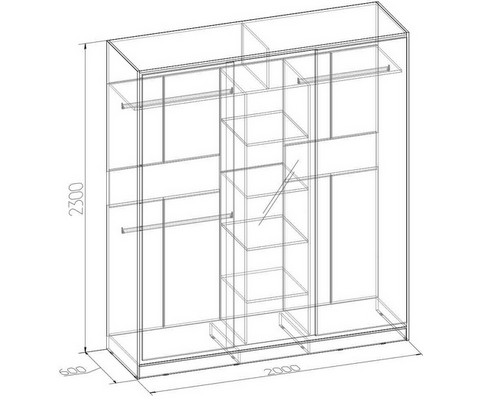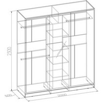 Шкаф оснащен тремя стационарными штангами для вешалок, двумя антресольными нишами и четырьмя полками.