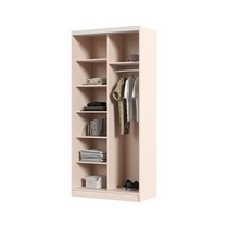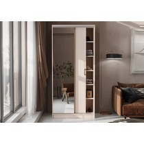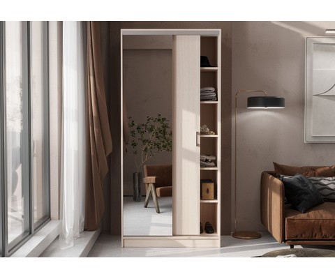 Зеркало расположено на левой стороне шкафа, за которой находятся полки для белья. С правой стороны имеется одна штанга, предназначенная для рубашек, брюк и блузок. .