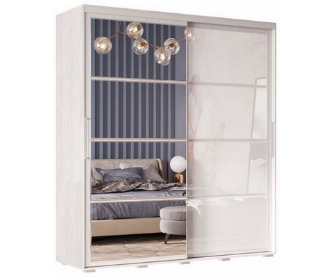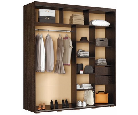 Шкаф оснащен штангой для вешалок, полками и двумя выдвижными ящиками.