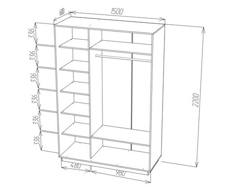 7 полок, 2 ниши, штангу для вешалок.