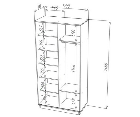 7 полок, 2 ниши, металлическую штангу для вешалок.