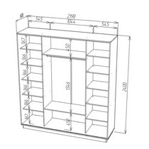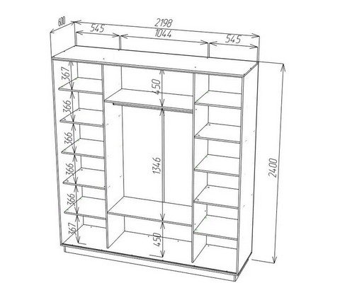 12 полок для одежды, 3 ниши, металлическая штанга для вешалок.
