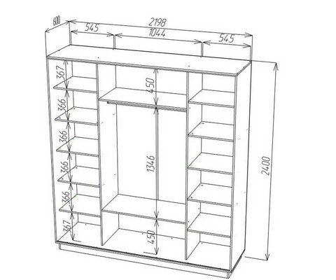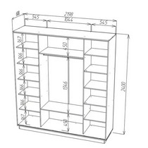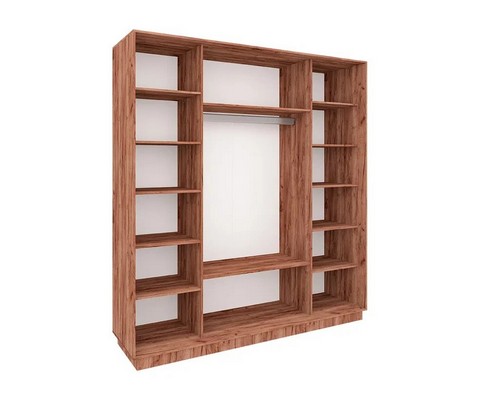 12 полок для одежды, 3 ниши, металлическая штанга для вешалок.