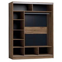 Внутреннее наполнение шкафа состоит из стеллажа для белья, четырех больших ниш внизу и вверху, а также стационарной штанги.