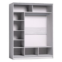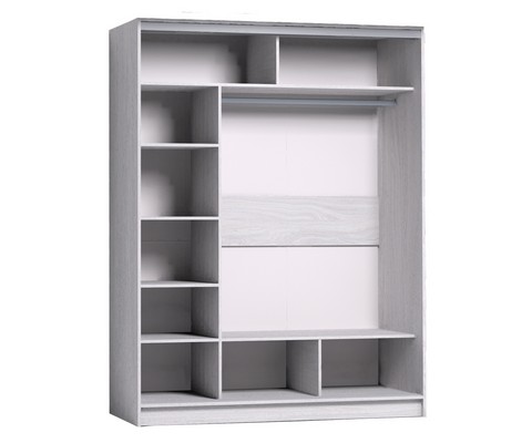 Внутреннее наполнение шкафа состоит из стеллажа для белья, четырех больших ниш внизу и вверху, а также стационарной штанги.