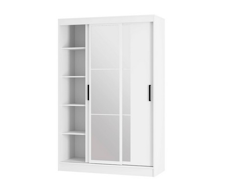 Шкаф-купе Тайм состоит с одной стороны из пяти полок для хранения вещей и постельного белья, с другой стороны вместительного отсека с двумя горизонтальными хромированными штангами для одежды на вешалках.
