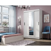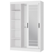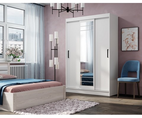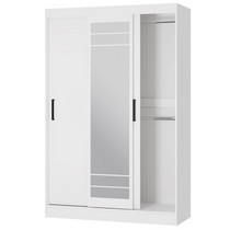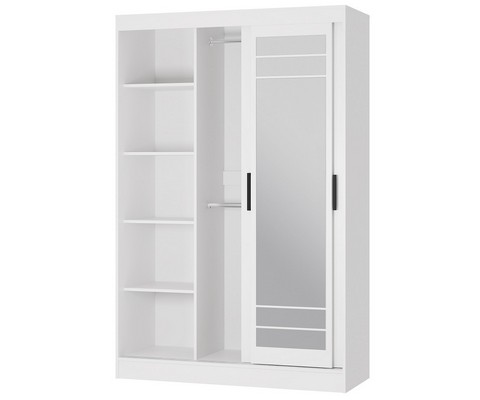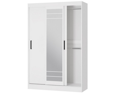 Шкаф-купе Тео ШКК-02 в белом цвете оборудован удобными дверьми с ручками, центральная створка выполнена в виде зеркала с еврокромкой. Внутри шкафа предусмотрены полки для одежды, аксессуаров и других предметов. Дополнительно в шкафу расположены две хромированные штанги для одежды.