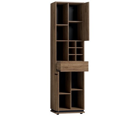Шкаф оснащен открытыми полками, барной нишей, выдвижным ящиком и двумя закрытыми секциями с полкой.