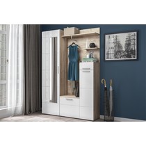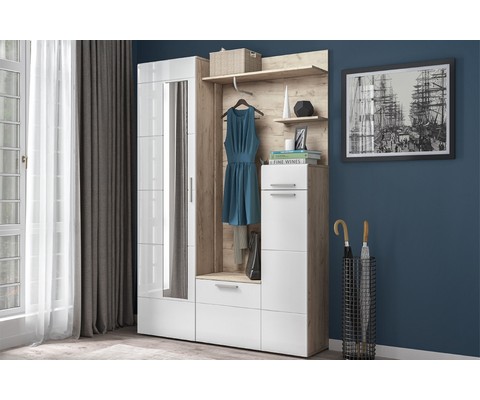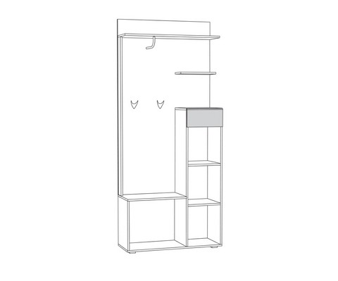 Шкаф многоцелевого назначения Лайн 10.16 Н состоит из открытой вешалки со штангой и двумя крючками, антресольной полки для головных уборов, тумбы для обуви, небольшого шкафа с выдвижным ящиком и полками.