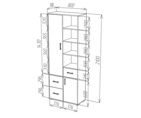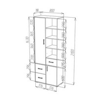 Шкаф с полками и ящиками Топаз крафт светлый имеет 4 открытые полки, 3 ящика полного выдвижения, шкафчик на 4 полки, распашную тумбу с нишей.
