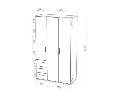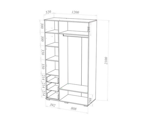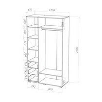 Конструкция шкафа ШОН-19 включает в себя: пять ниш, две продольные полки, штанга для одежды, стационарная тумба с тремя ящиками 214мм.