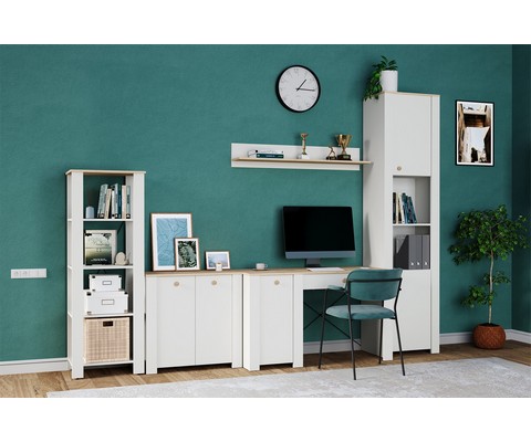 Шкаф торцевой Джастин 16.306 состоит из верхней и нижней полки с распашными дверцами, а центральную часть занимают две открытые ниши.