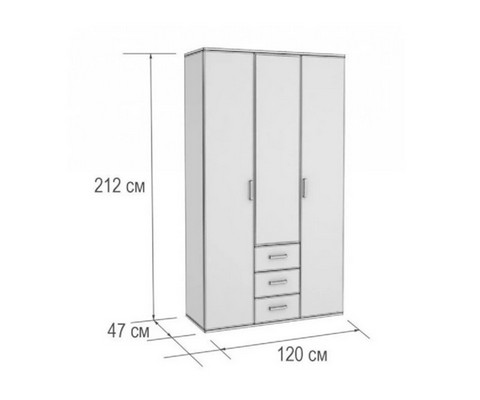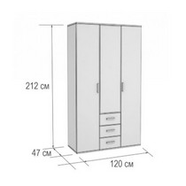 Оснащён тремя ящиками и зеркальной дверью, металлической перекладиной и полками для одежды.