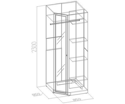 Внутри шкафа расположены: антресольная полка, штанга для вешалок и четыре полки для одежды.