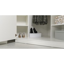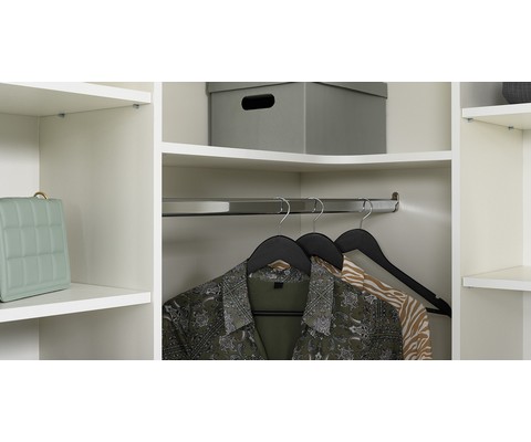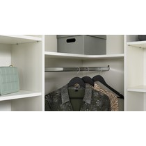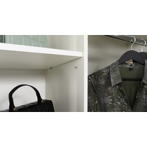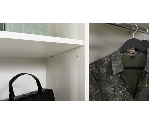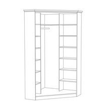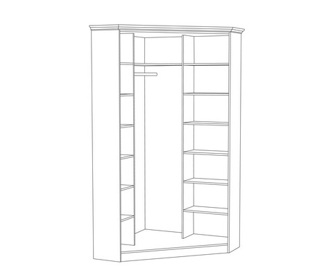 Двустворчатый угловой шкаф для одежды Ливерпуль 13.124.02 состоит из антресольной полки, секции со штангой для одежды на вешалках и двух боковых секций с полками для белья.