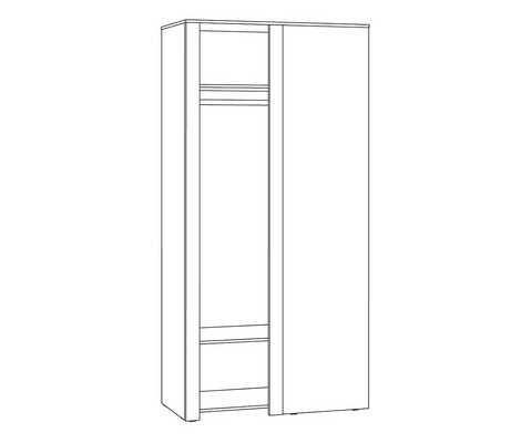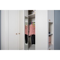 Шкаф угловой Джастин 13.229 состоит из антресольной полки для головных уборов и отсека с продольной штангой для вешалок и нижней полки для обуви.