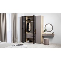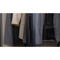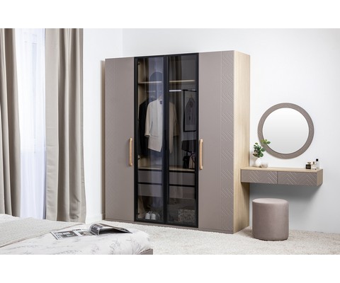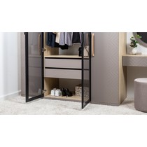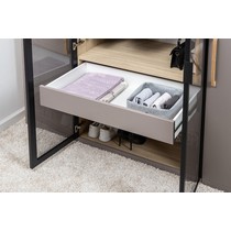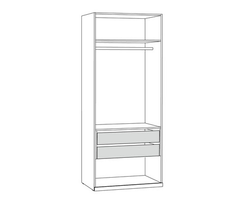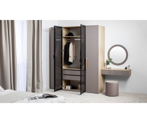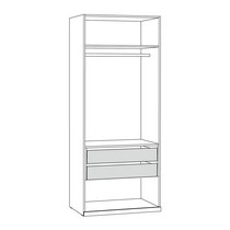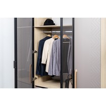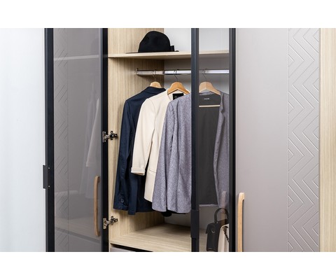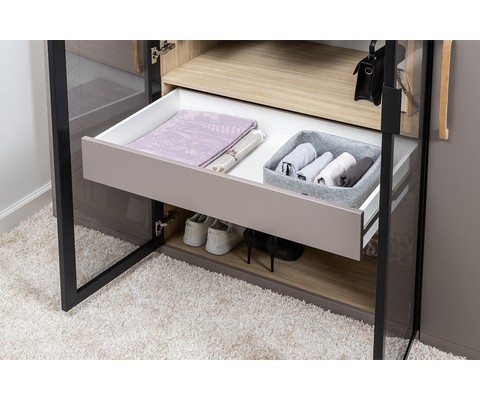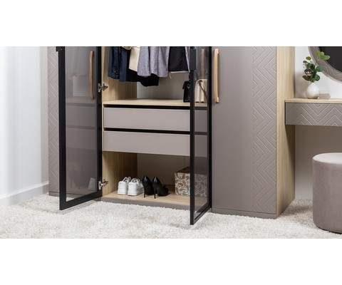 Шкаф-витрина Амьен 16.395 состоит из антресольной полки, секции с продольной штангой для вешалок, двух выдвижных ящиков и полки для обуви.