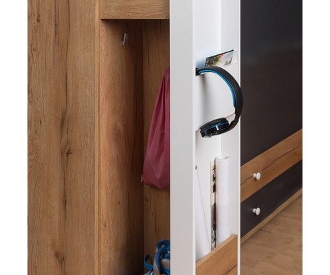 Зона хранения на самом фасаде включает в себя: карман для высоких бумаг и ватманов, ручку, выполненную виде полочки, и два крючка.