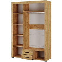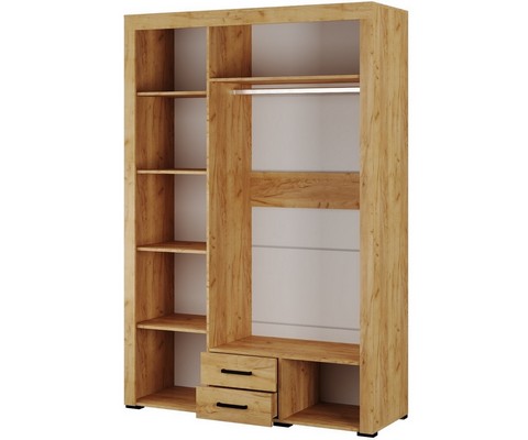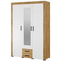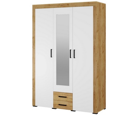 Трехдверный шкаф с зеркалом для одежды оснащен полками, продольной штангой для вешалок и двумя выдвижными ящиками.