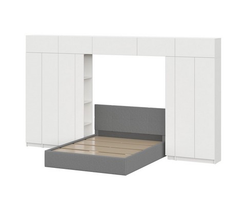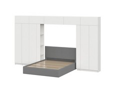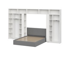 Комплект включает: кровать с основанием 160x200 см, два шкафа двухстворчатых, два угловых окончания, четыре верхних шкафа 800, один навесной шкаф 1000 и узкий пенал.