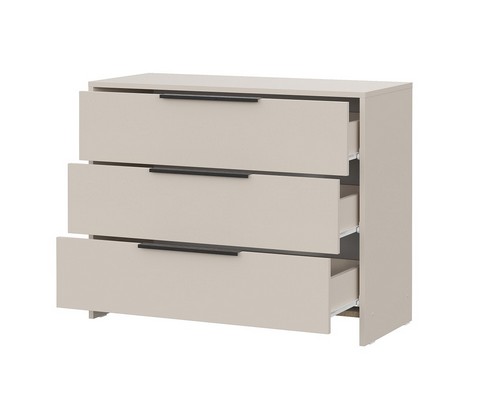 На фасадах ящиков комода установлены стильные накладные ручки черного цвета.