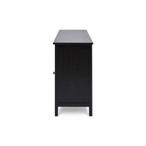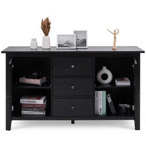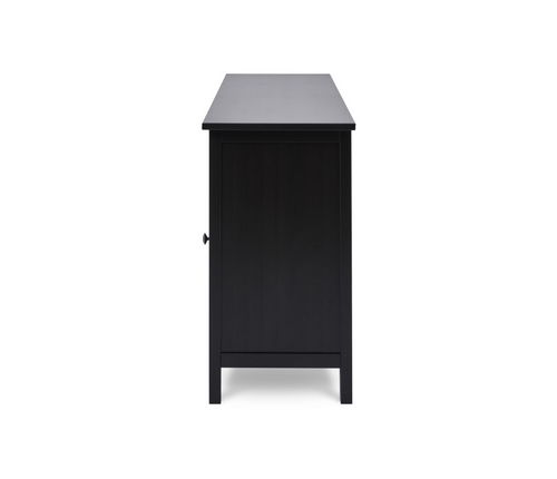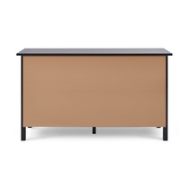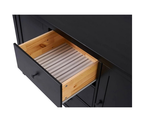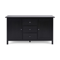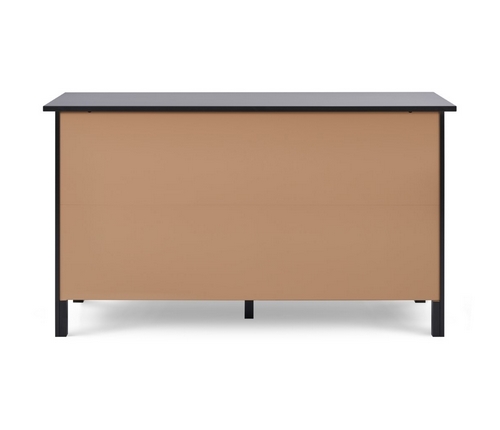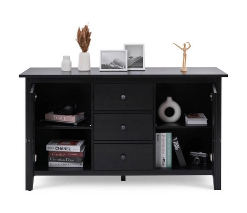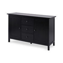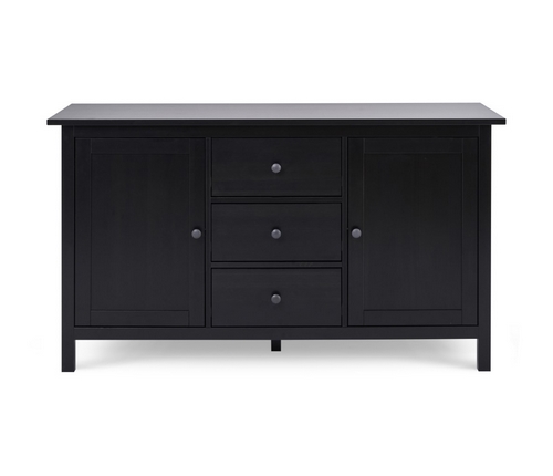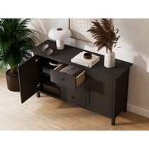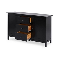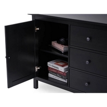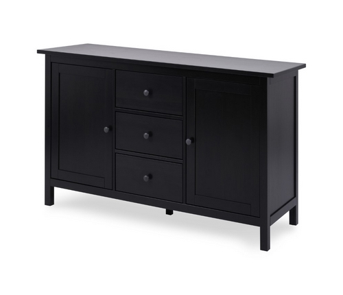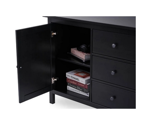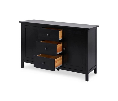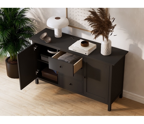Комод оснащен тремя выдвижными ящиками по центру и двумя боковыми шкафчиками с полками.
