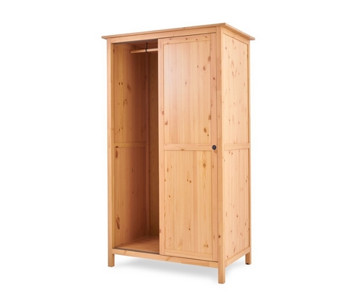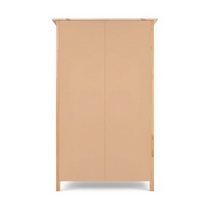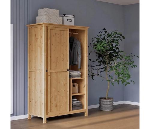 Внутреннее наполнение включает две нижние полки для хранения постельного белья, полотенец или одежды и деревянную штангу по всей ширине шкафа.