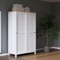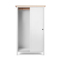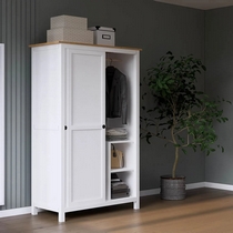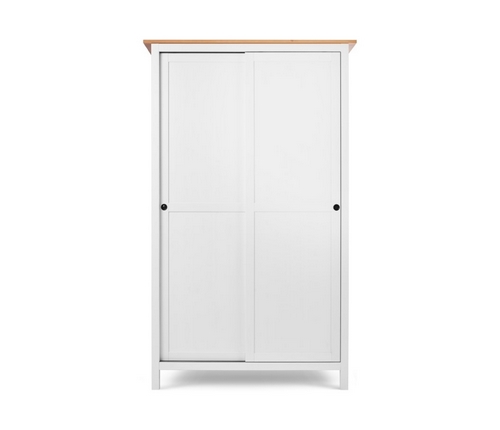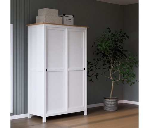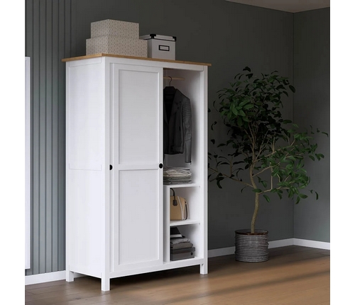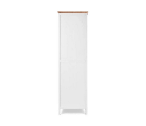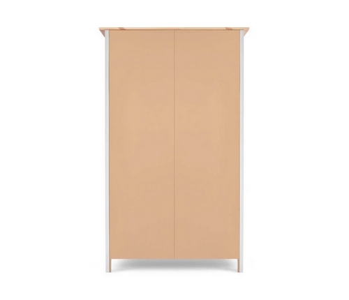 Внутреннее наполнение включает две нижние полки для хранения постельного белья, полотенец или одежды и деревянную штангу по всей ширине шкафа.