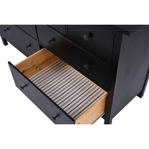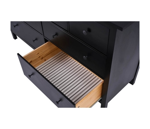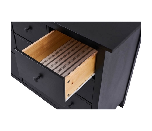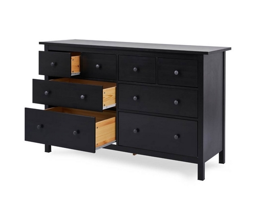 Комод оснащен четырьмя верхними маленькими и четырьмя большими выдвижными ящиками разной высоты.