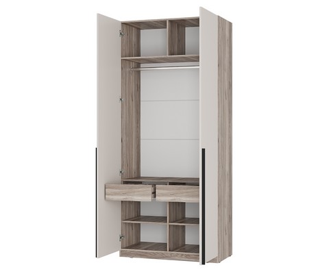 Двухстворчатый шкаф Урбан ШК-03 оснащен полками, выдвижными ящиками и вертикальным отсеком со штангой.