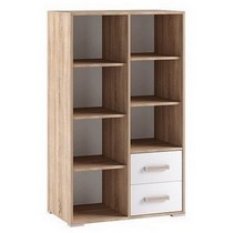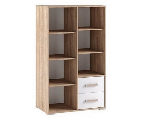 Стеллаж оснащен закрытым отделением с дверцей и двумя выдвижными ящиками.