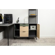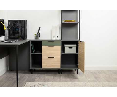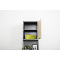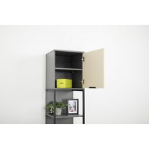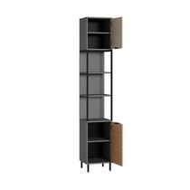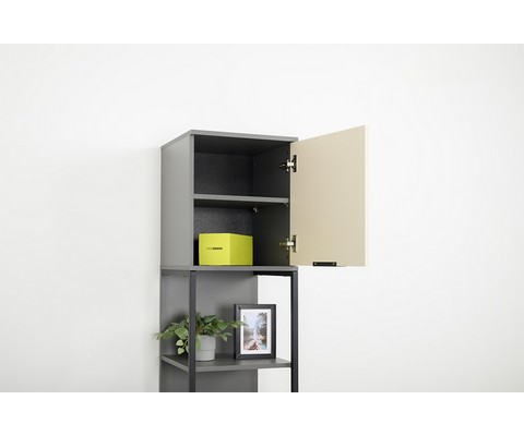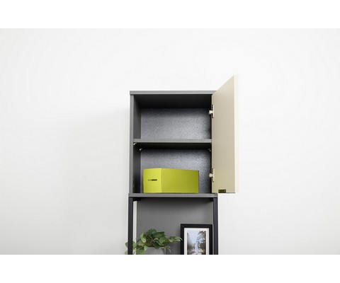 Стеллаж Марвэл 16.426 выполнен в сочетании темно-серого корпуса и фасадов в оттенках сатин и плэйн.