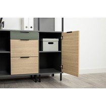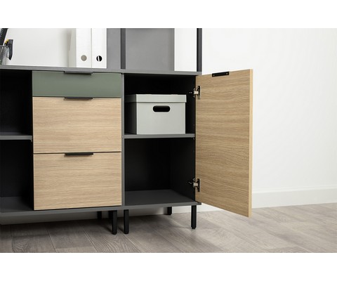 Он состоит из верхнего и нижнего отсека с полками с распашными дверцами и трех открытых полок по центру.