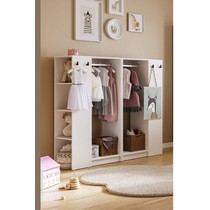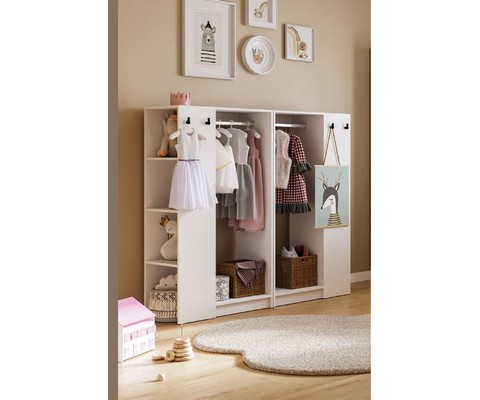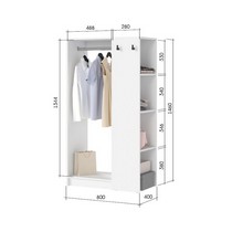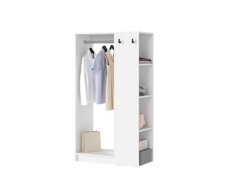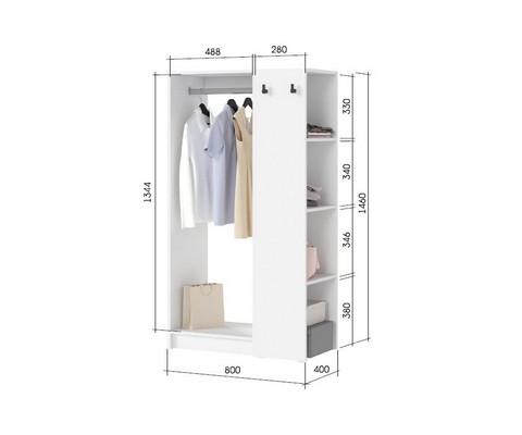 Стеллаж Руна СТЛ 01 состоит отсека со штангой для вешалок и торцевой секции с двумя крючками и полками для белья и аксессуаров.