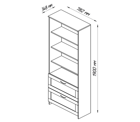 Стеллаж широкий, с двумя ящиками и четырьмя полками.
