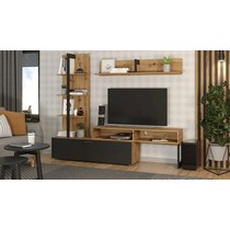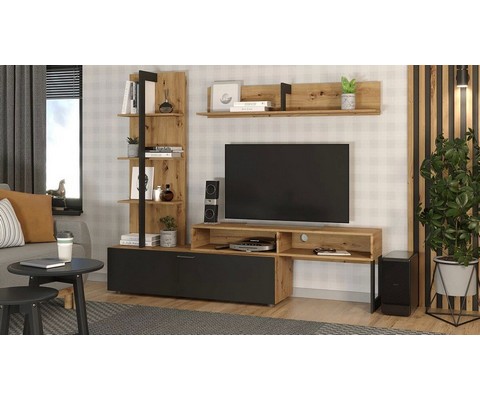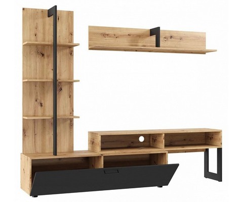 Компоненты, входящие в комплект: полка навесная:, 1 полка, стеллаж:, 3 полки, тумба под ТВ:, 1 дверца, 2 полки.