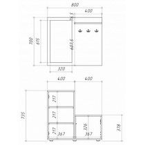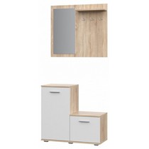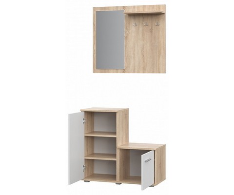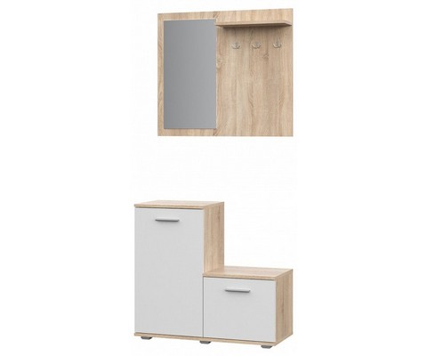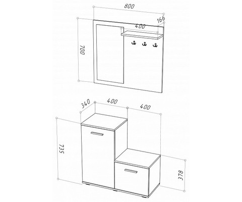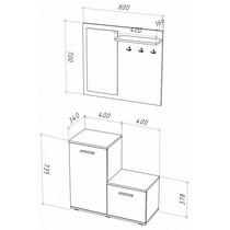 Компоненты, входящие в комплект: 1 вешалка настенная - 800x166x700 мм, 1 тумбочка - 400x340x378 мм, 1 тумбочка - 400x340x735 мм.