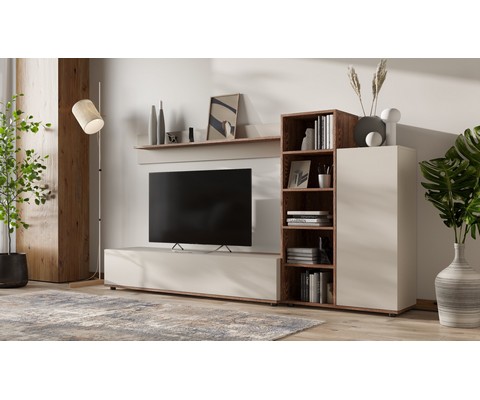 Закрытый небольшой шкаф сохраняет атмосферу безупречного порядка и телевизионная тумба с тремя просторными отсеками для хранения.