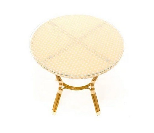Материал: полиэтилен (оплетка), железная труба (основа), стекло (столешница).