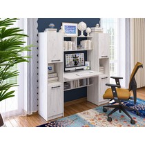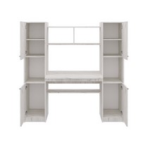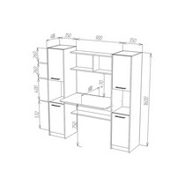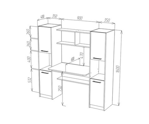 Оснащение компьютерного стола Фронда-5: четыре глухих распашных шкафчика по две вместительные ниши в каждом, пять полок, верхняя часть надстройки образует дополнительную нишу.