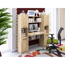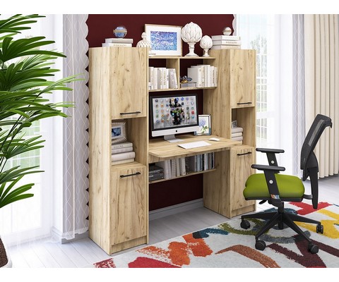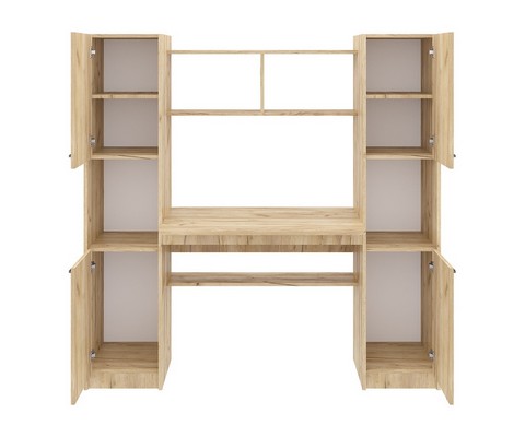 Оснащение компьютерного стола Фронда-5: четыре глухих распашных шкафчика по две вместительные ниши в каждом, пять полок, верхняя часть надстройки образует дополнительную нишу.