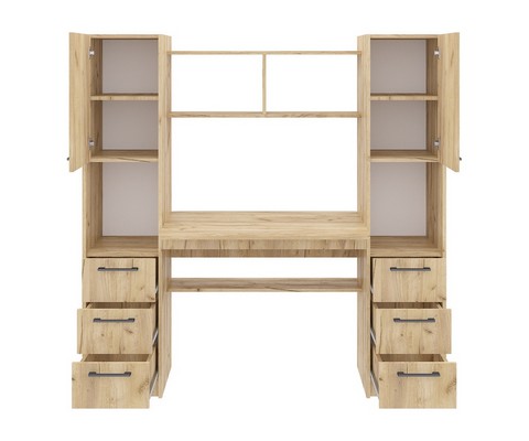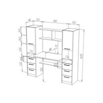 Оснащение компьютерного стола Фронда-5: два глухих распашных шкафчика по две вместительные ниши в каждом, 2 комплекта из трех выдвижных ящиков 00-00100373/3419, пять полок, верхняя часть надстройки образует дополнительную нишу.