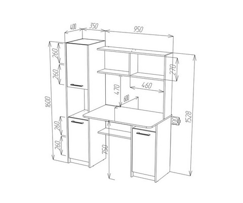 Комплектация компьютерного стола Фронда-6: три глухих распашных шкафчика по две вместительные ниши в каждом, пять полок, верхняя часть надстройки образует дополнительную нишу.