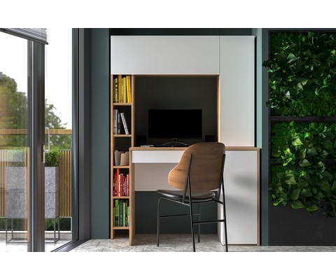 Стол компьютерный Комфорт 12.71 оснащен открытыми и закрытыми полками с распашным дверцами, ящиком и секцией для ПК.