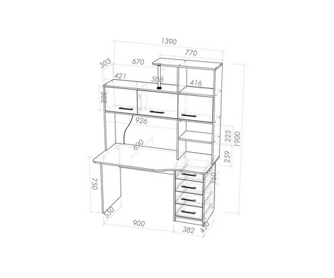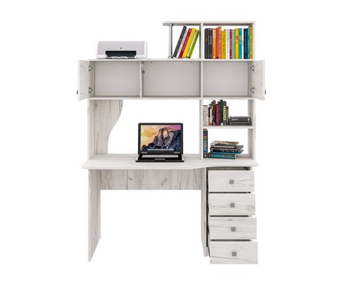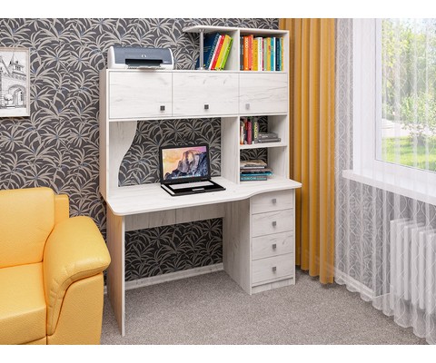 Компьютерный стол СК-16 с фигурной столешницей включает в себя: четыре ящика полного выдвижения (шариковые направляющие), четыре открытые ниши, дополнительную полку на опоре цвета «хром».