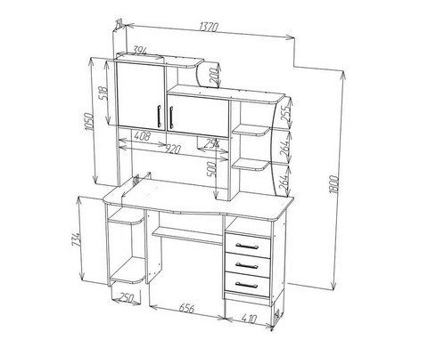 6 открытых ниш, полка под принтер и монитор, 2 глухих шкафчика по 2 дополнительные полки в каждом.