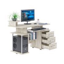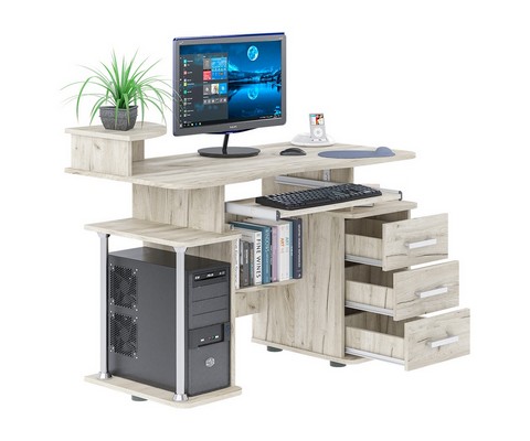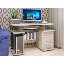 Модель компьютерного стола СК-22 проста и функциональна, снабжена: тумба, три ящика полного выдвижения и три открытые ниши, дополнительная радиусная полочка, пока для клавиатуры и ниша под системный блок, декорированная хромированной трубой.