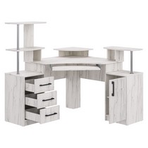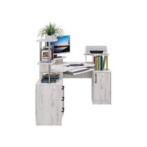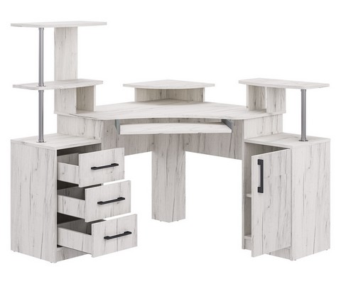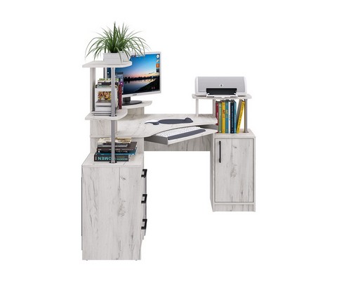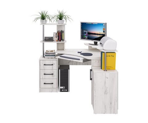 Оснащение углового компьютерного стола СК-26: фигурная столешница с надстройкой под монитор, полка под клавиатуру и надстройка под принтер, декорированная хромированной трубой, четыре ниши, стационарная тумба с распашной дверцей и полками, тумба с тремя ящиками полного выдвижения на шариковых направляющих, края стола сглажены для комфортного пользования.